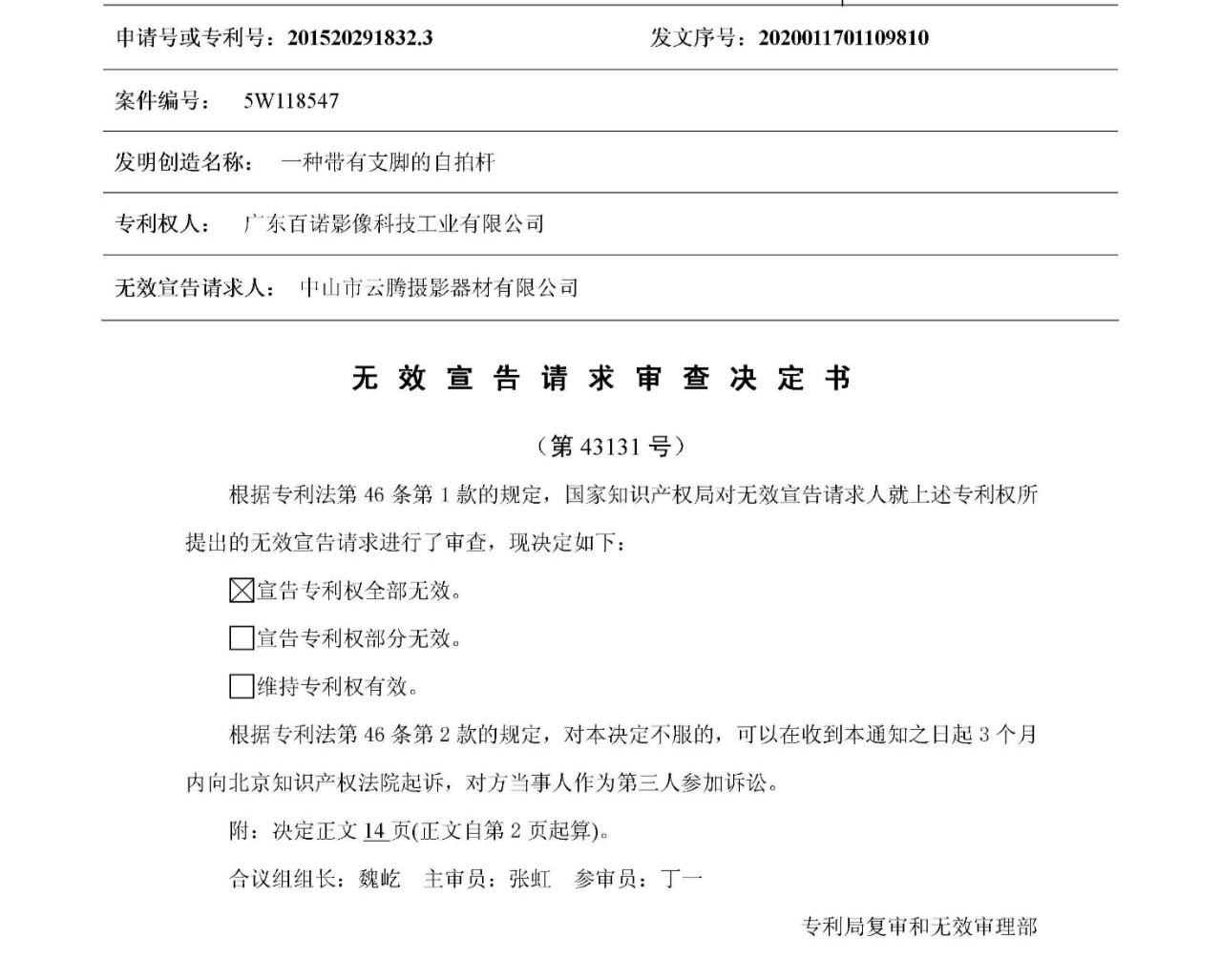 日前,由三聚陽(yáng)光知識(shí)產(chǎn)權(quán)集團(tuán)旗下三聚陽(yáng)光代理公司和北京易聚律師事務(wù)所代理的一項(xiàng)專利無(wú)效宣告案勝利結(jié)案。在國(guó)家知識(shí)產(chǎn)權(quán)局作出的第43131號(hào)無(wú)效審查決定中,廣東百諾影像科技工業(yè)有限公司擁有的專利號(hào)為201520291832.3的”一種帶有支腳的自拍桿“專利,專利權(quán)被宣告全部無(wú)效。此案中,三聚陽(yáng)光及易聚律所代理方為請(qǐng)求人中山市云騰攝影器材有限公司。