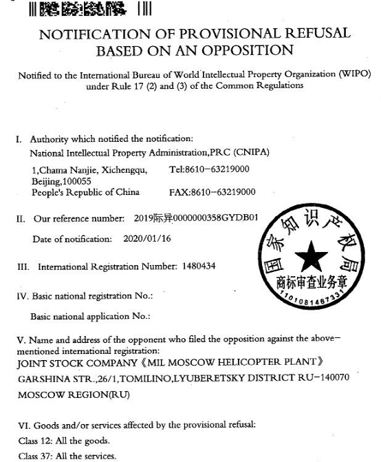 三聚陽光代表異議人米里莫斯科直升機廠股份公司于2019年12月對被異議商標第G1480434號基于近似的理由提出異議申請,并提供大量證據(jù)。現(xiàn)國家知識產(chǎn)權(quán)局下基于該異議申請駁回了第G1480434號商標的中國注冊申請。