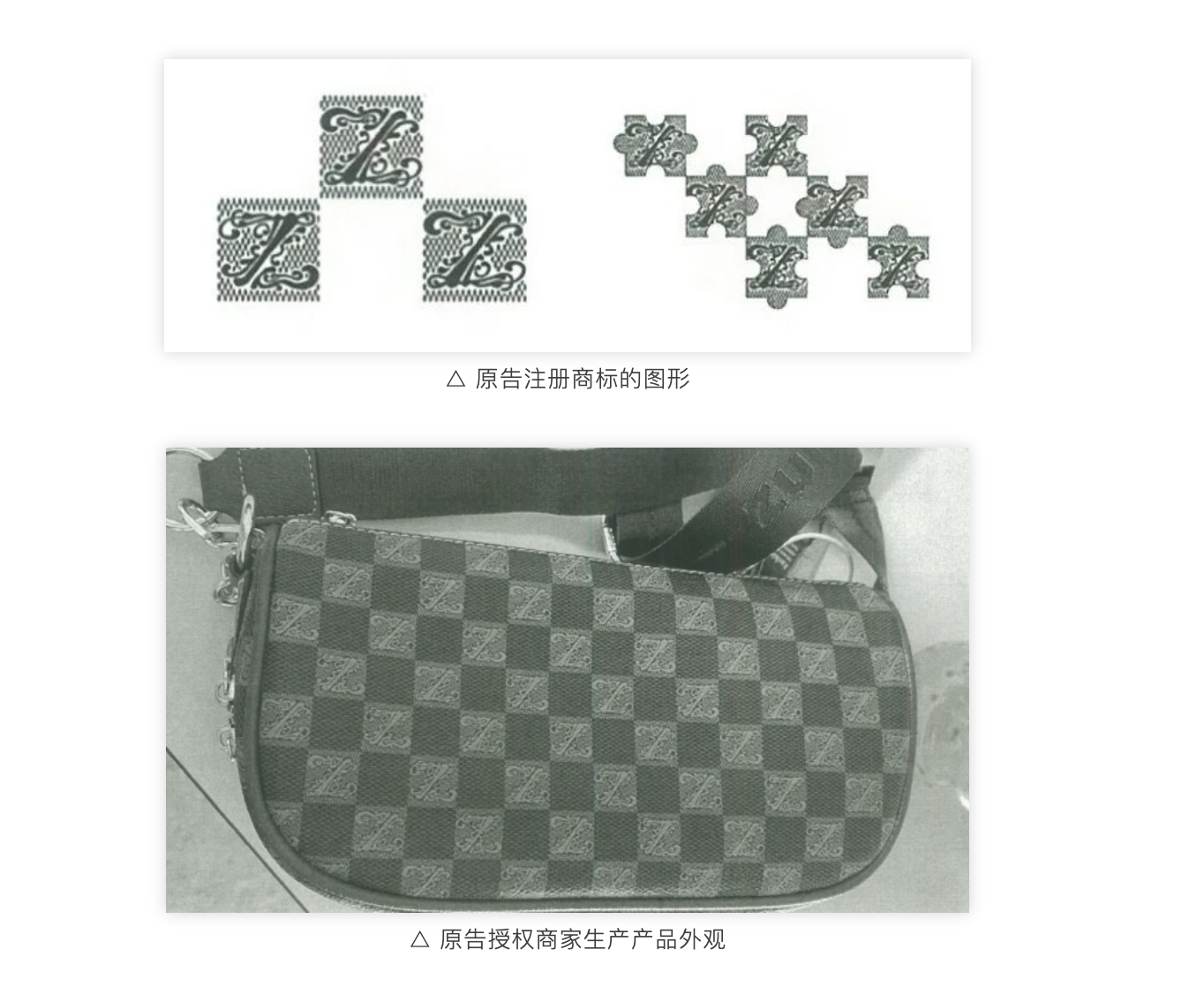 我們能看到,原告的商標圖形主要是字母“Z”構(gòu)成的重復、棋盤式的圖案。原告授權(quán)廠家生產(chǎn)的包,表面的圖案也正是由重復、棋盤式的“Z”形字母和方格構(gòu)成。
