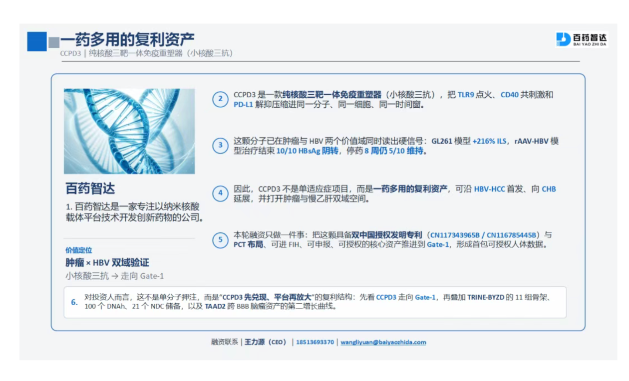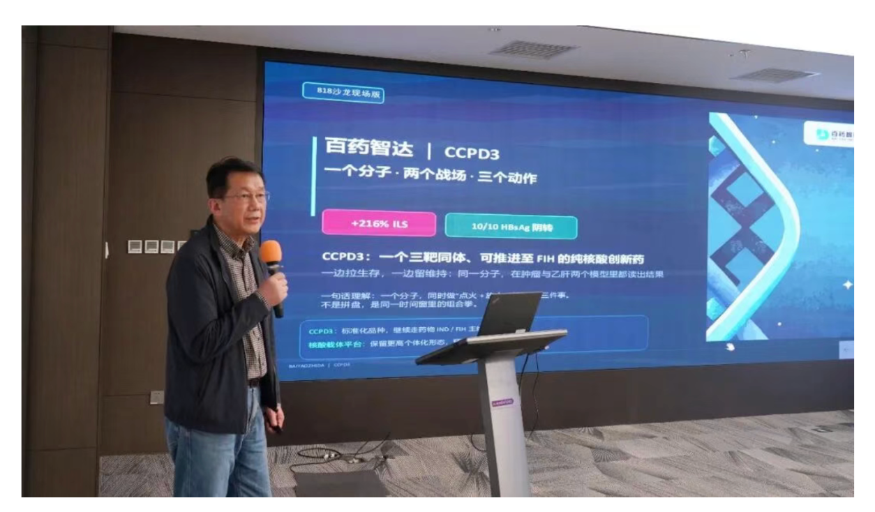 百藥智達(dá)創(chuàng)始合夥人、執(zhí)行長(zhǎng)王力源做了「CCPD3 B 型肝炎與肝癌創(chuàng)新藥實(shí)踐」專題分享。百藥智達(dá)是三聚陽(yáng)光集團(tuán)關(guān)聯(lián)基金投資的醫(yī)藥項(xiàng)目,百藥智達(dá)是一家專注於奈米級(jí)藥物載體技術(shù)研發(fā)與標(biāo)靶藥物開發(fā)的生物醫(yī)藥公司,其核心產(chǎn)品是基於 RNA 奈米技術(shù)的藥物載體平臺(tái),能實(shí)現(xiàn)精準(zhǔn)標(biāo)靶給藥,顯著降低藥物毒性並提升療效。已開發(fā) 30 多種創(chuàng)新藥,涵蓋癌癥、老人癡呆等疾病領(lǐng)域,擁有 8 項(xiàng)國(guó)際專利和 22 項(xiàng)國(guó)內(nèi)專利。其技術(shù)透過化學(xué)合成實(shí)現(xiàn)大規(guī)模生產(chǎn),成本可控,已與多家藥廠達(dá)成合作意向,部分產(chǎn)品進(jìn)入臨床前階段。