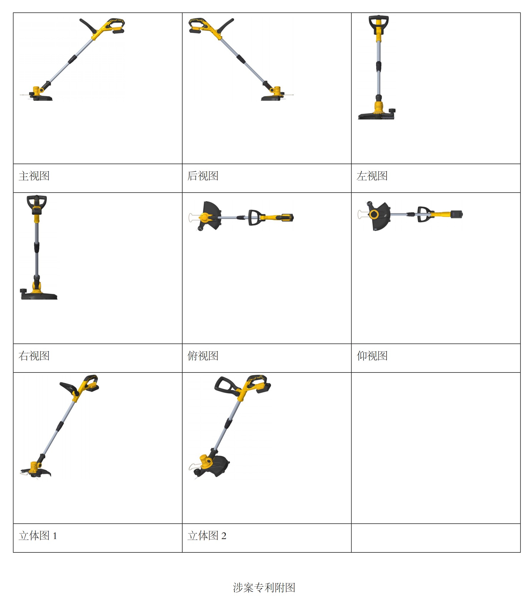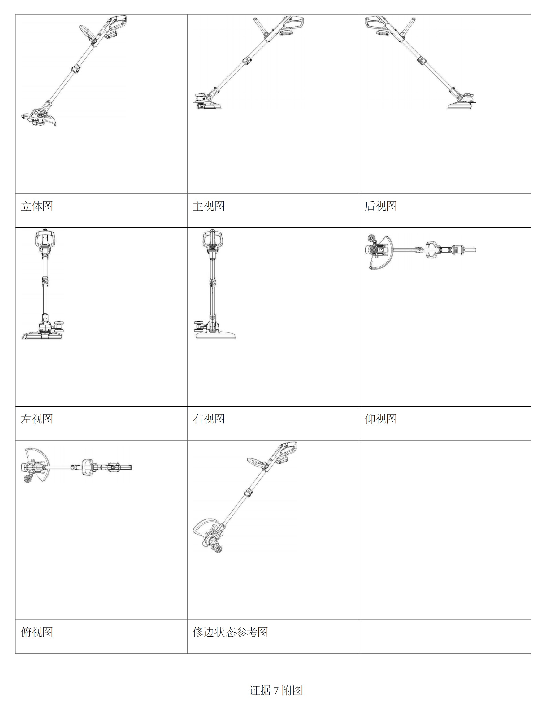 通過涉案專利與證據(jù) 7 的對比可知,兩者的整體部件組成及各部件的形狀和相對位置基本一致,上部為手柄,中間為桿體、桿體下方為電機、電機下方為鈍角扇形擋草板,二者相同點使得兩者給一般消費者帶來了相似的整體視覺效果。一般消費者經(jīng)過對涉案專利與證據(jù) 7的整體觀察可以看出,二者的差別對于產(chǎn)品外觀設(shè)計的整體視覺效果均不足以產(chǎn)生顯著影響,涉案專利與證據(jù) 7 相比不具有明顯區(qū)別,涉案專利不符合專利法第 23 條第 2 款的規(guī)定。