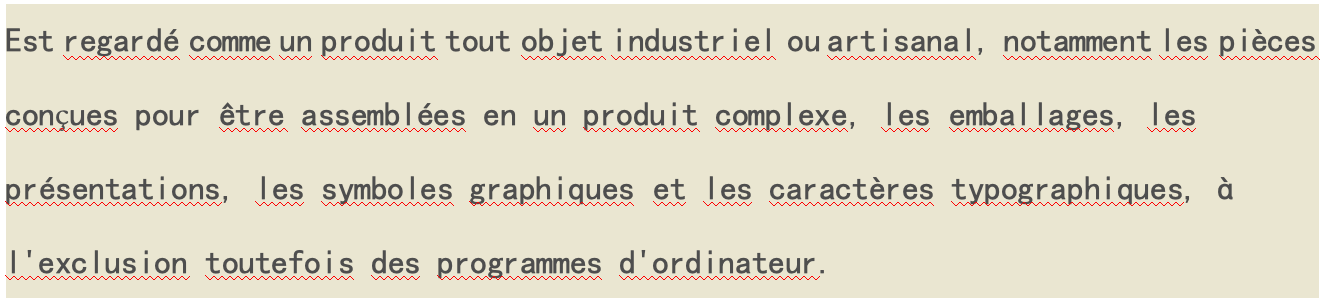 “任何工業(yè)或手工制品都應(yīng)當(dāng)被認(rèn)定為產(chǎn)品,特別是被設(shè)計(jì)成組裝為復(fù)雜產(chǎn)品、包裝、裝潢、圖形符號(hào)和排版字體的部分,但不包括計(jì)算機(jī)程序。”