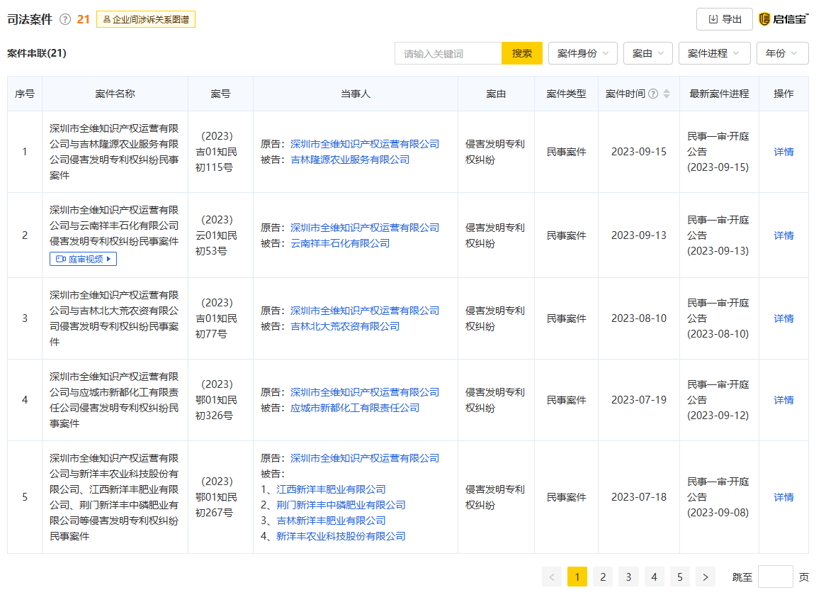 隨后,全維公司以此為“武器”,自2020年起,針對(duì)廣東、湖北、四川、福建、山東等地的二十余家復(fù)合肥生產(chǎn)企業(yè)發(fā)起了密集的專利侵權(quán)訴訟,索賠金額從100萬(wàn)元到1000萬(wàn)元不等,甚至要求企業(yè)拆除生產(chǎn)設(shè)備。