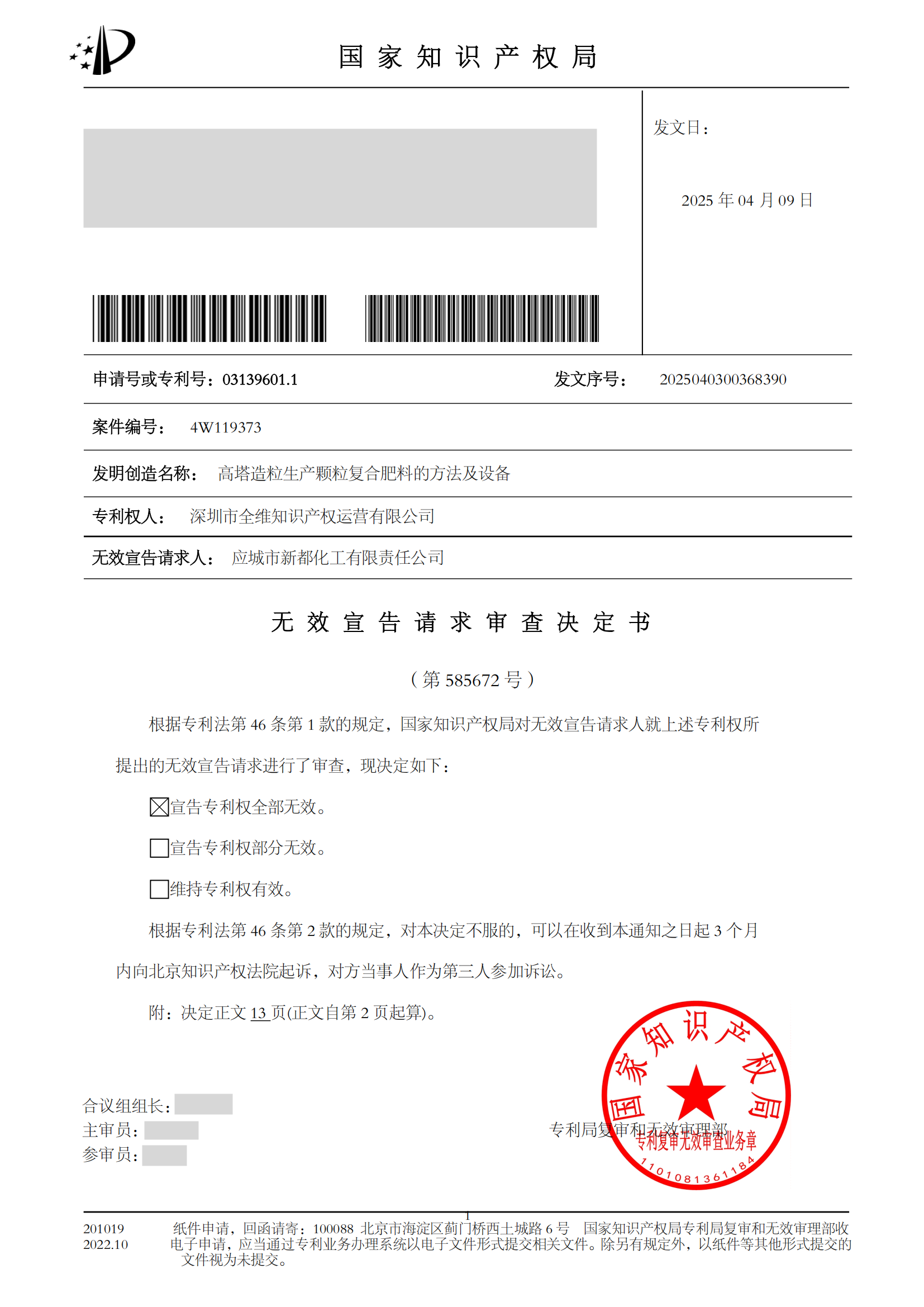 據(jù)此,國(guó)家知識(shí)產(chǎn)權(quán)局于2025年4月9日正式發(fā)出第585672號(hào)無(wú)效宣告請(qǐng)求審查決定書,宣告專利號(hào)為 03139601.1 的“高塔造粒生產(chǎn)顆粒復(fù)合肥料的方法及設(shè)備”發(fā)明專利權(quán)全部無(wú)效。