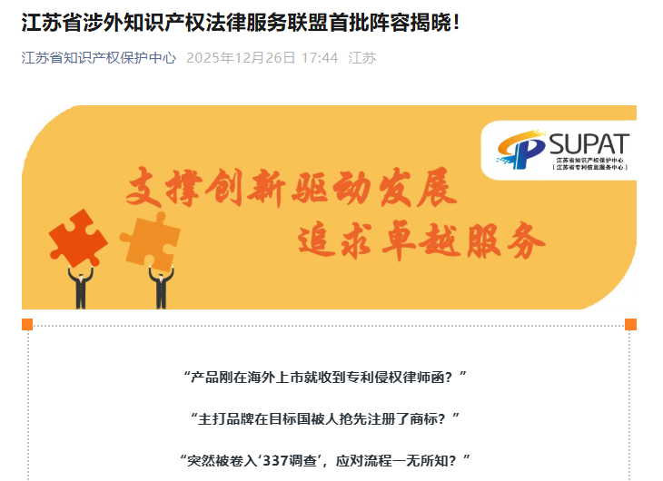 近日,三聚陽光正式加入江蘇省涉外知識(shí)產(chǎn)權(quán)法律服務(wù)聯(lián)盟。該聯(lián)盟面向江蘇企業(yè)