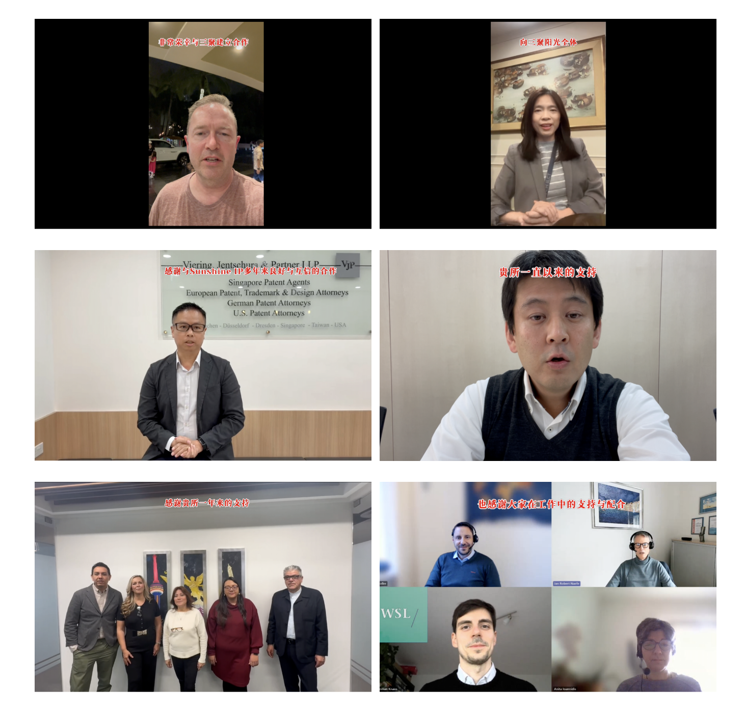 現(xiàn)場(chǎng)播放了來(lái)自全國(guó)各分公司以及合作外所的拜年視頻。從北京總部到香港、華南、華東、浙江、??诘确种C(jī)構(gòu),再到來(lái)自美國(guó)、泰國(guó)、日本、新加坡、墨西哥等國(guó)際合作伙伴,不同地域、不同語(yǔ)言的祝福匯聚在一起。過(guò)去一年,三聚陽(yáng)光深度參與了AIPPI、INTA等國(guó)際性會(huì)議,這不僅提升了品牌國(guó)際影響力,也通過(guò)視頻串聯(lián)起了三聚陽(yáng)光服務(wù)全球創(chuàng)新的廣闊視野。