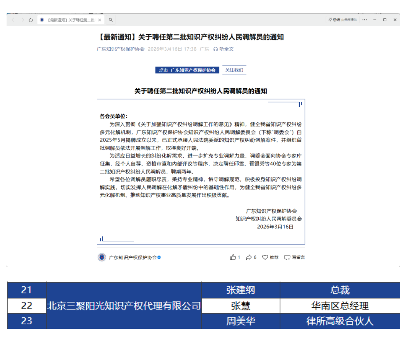 三聚陽光長期關(guān)注知識(shí)產(chǎn)權(quán)保護(hù)鏈條中的爭議預(yù)防、糾紛處置與協(xié)同保護(hù)。此前,三聚陽光曾赴中國(廣州)知識(shí)產(chǎn)權(quán)保護(hù)中心開展交流,就快速協(xié)同保護(hù)、維權(quán)援助、知識(shí)產(chǎn)權(quán)分析咨詢等議題進(jìn)行溝通;深圳地區(qū)主管單位也曾到訪三聚陽光北京總部調(diào)研。此次三位專業(yè)人士獲聘廣東省知識(shí)產(chǎn)權(quán)糾紛人民調(diào)解員,有望進(jìn)一步推動(dòng)公司在華南地區(qū)更好參與知識(shí)產(chǎn)權(quán)糾紛多元化解實(shí)踐,為創(chuàng)新主體提供更專業(yè)、更高效、更具前瞻性的服務(wù)支持。