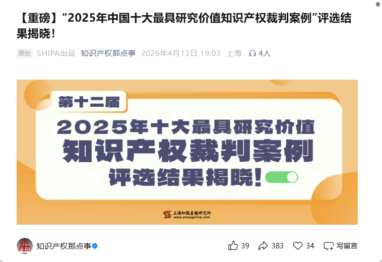 【重磅】“2025年中國(guó)十大最具研究?jī)r(jià)值知識(shí)產(chǎn)權(quán)裁判案例”評(píng)選結(jié)果揭曉!