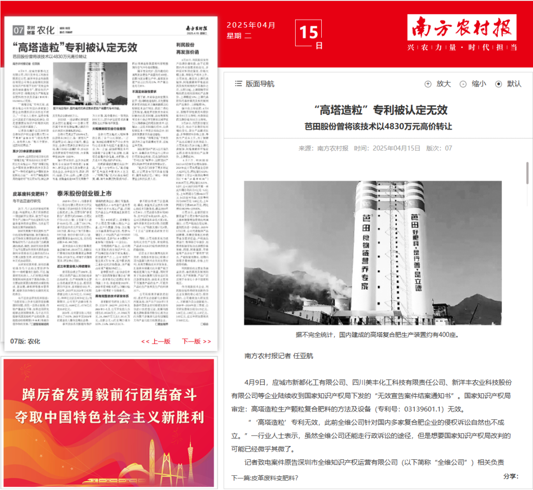這起案件之所以具有代表性,一個(gè)重要原因在于它回應(yīng)了復(fù)合肥行業(yè)長(zhǎng)期受到關(guān)注的“問(wèn)題專利”治理難題。北京知識(shí)產(chǎn)權(quán)法院在年度案例中明確指出,高塔造粒是復(fù)合肥生產(chǎn)的主流工藝,國(guó)內(nèi)相關(guān)裝置數(shù)量眾多。涉案專利在被受讓后,曾被用于針對(duì)多家復(fù)合肥生產(chǎn)企業(yè)提起批量侵權(quán)訴訟,給企業(yè)正常經(jīng)營(yíng)和行業(yè)預(yù)期帶來(lái)較大影響。該案最終推動(dòng)涉案專利被宣告全部無(wú)效,相關(guān)訴訟亦因權(quán)利基礎(chǔ)喪失而終結(jié),從根本上消除了行業(yè)層面的侵權(quán)風(fēng)險(xiǎn)。