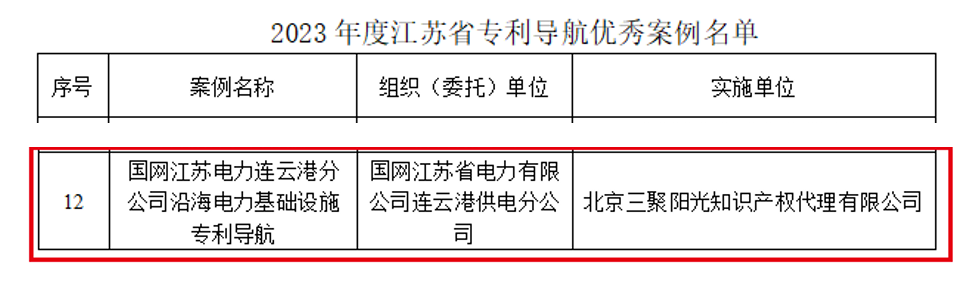 近日,三聚陽光集團研究咨詢團隊承擔(dān)的《沿海電力基礎(chǔ)設(shè)施專利導(dǎo)航》項目成果獲江蘇省知識產(chǎn)權(quán)局高度認可,正式入選首批“江蘇省專利導(dǎo)航優(yōu)秀案例名單”,并于2024年全國知識產(chǎn)權(quán)宣傳周活動江蘇分會場活動現(xiàn)場發(fā)布。