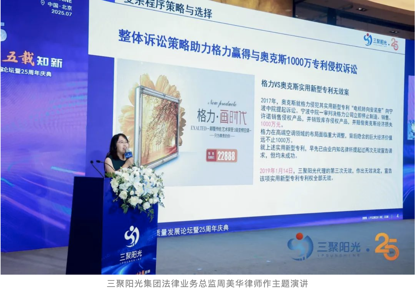 三聚陽光集團(tuán)法律業(yè)務(wù)總監(jiān)周美華律師在《專利訴訟策略與實(shí)施》的主題演講中,通過多個(gè)具體案例深入探討了如何有效應(yīng)對(duì)復(fù)雜的專利糾紛,并分享了寶貴的實(shí)戰(zhàn)經(jīng)驗(yàn)。她回顧了格力與奧克斯的經(jīng)典專利侵權(quán)糾紛案件,展示了復(fù)雜訴訟程序及策略選擇對(duì)最終勝訴的重要性,詳細(xì)分析了多輪反制措施的應(yīng)用,如提起專利權(quán)屬訴訟、無效宣告等手段,并展示了如何利用國外證據(jù)成功使對(duì)方專利全部無效。